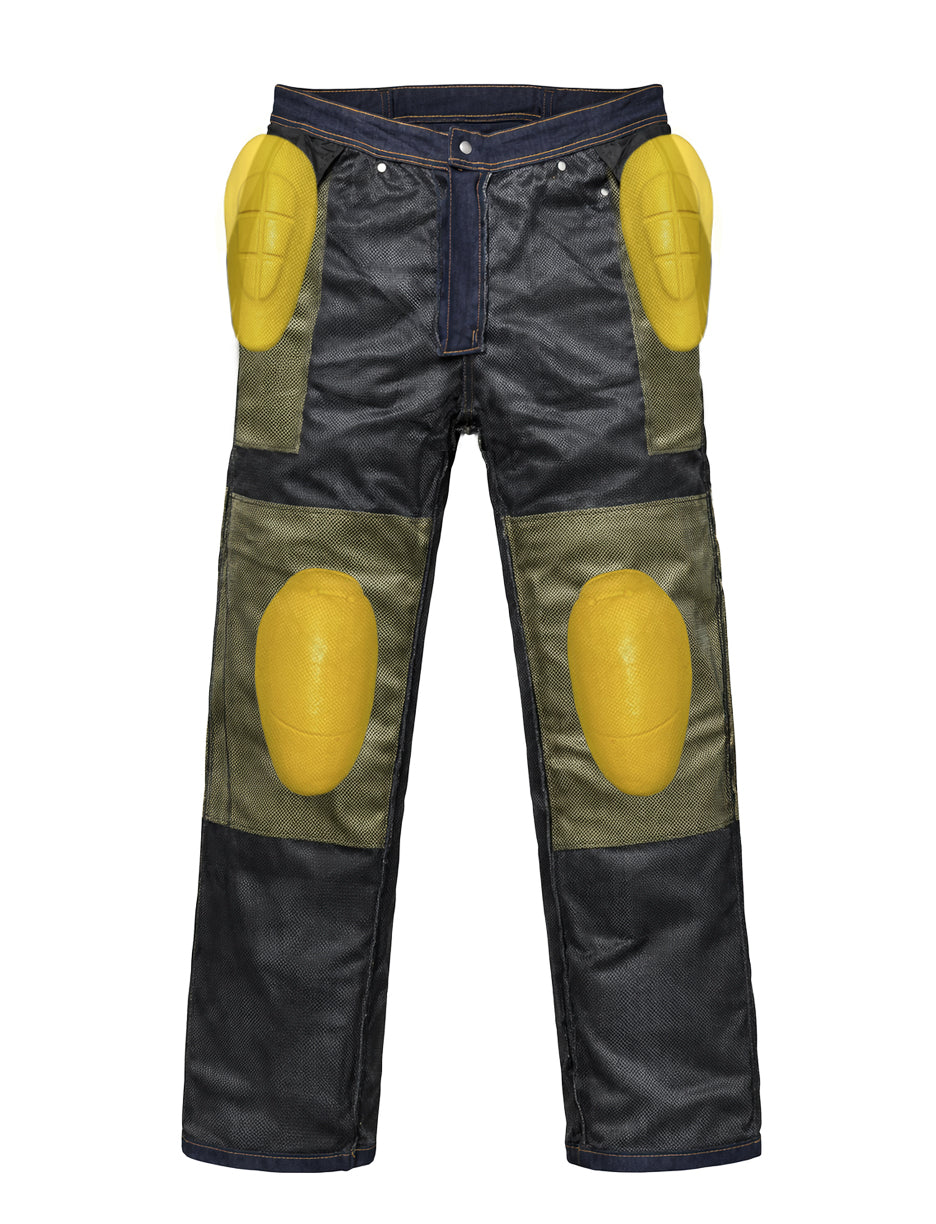 Old Soul motorcycle jeans, offering serious protection while keeping the look and comfort of your everyday favourites. Constructed with a mid-weight denim/Cordura Blend, plus DuPont™ Kevlar® Fibre through the contact areas and cooling mesh liner, these are the Kevlar motorcycle jeans you'll be able to wear through the summer. CE Level 2 armour included at knees and hips. Easy Access knee armor allows you to remove or adjust armor without take the pants off.